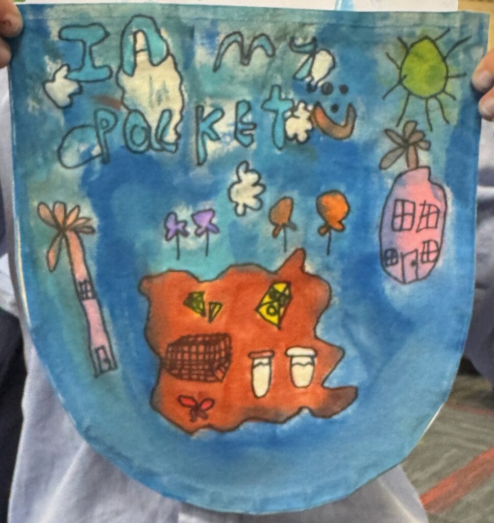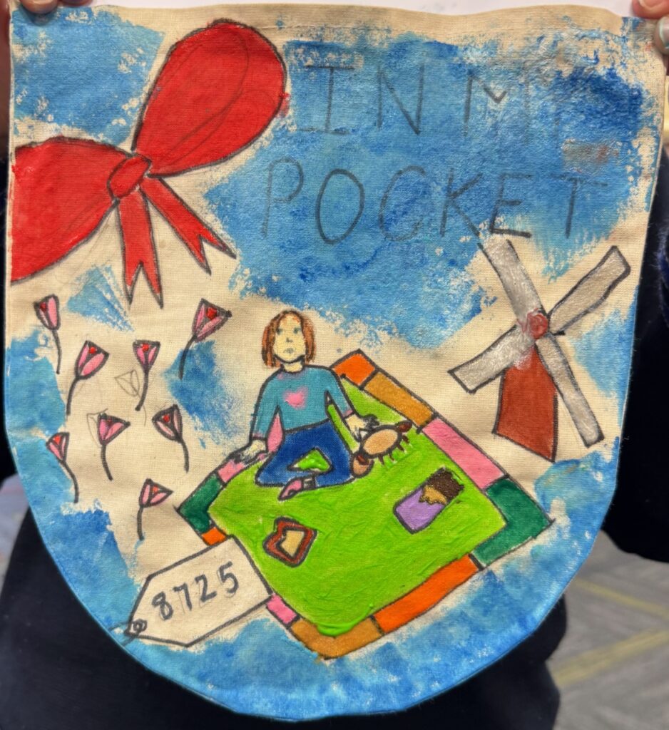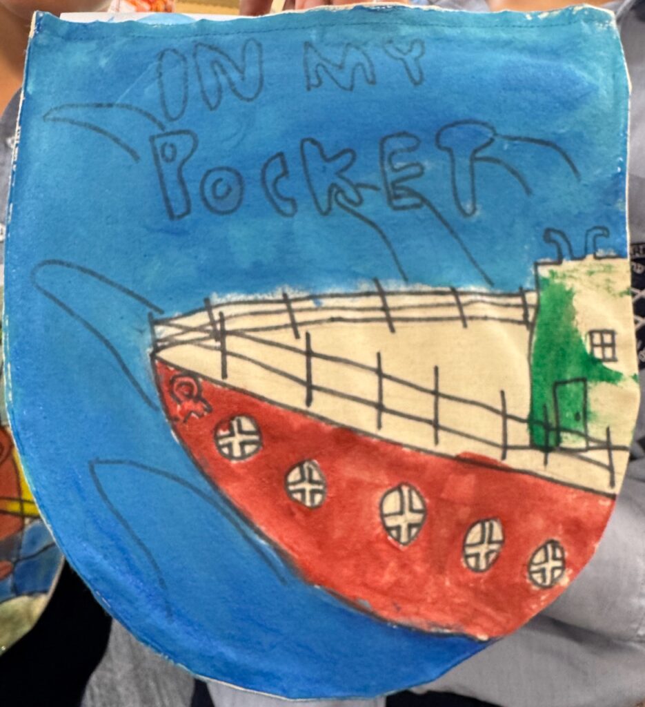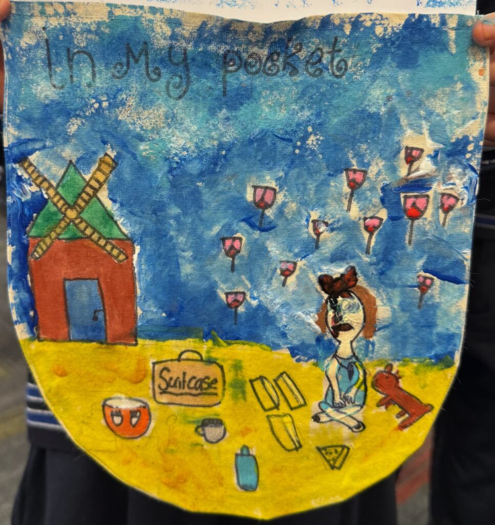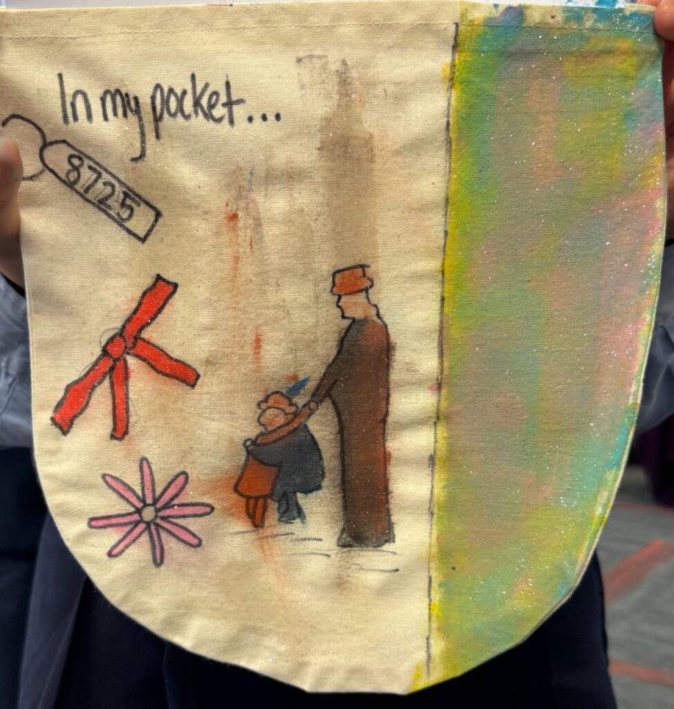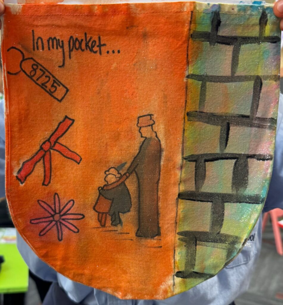 The ‘In My Pocket’ session invited students to step into the shoes of children from that time, considering the difficult choices they faced, the items they might have taken with them and the memories they held on to. Using fabric paints and markers, each student then decorated their own calico pocket, transforming it into a personal expression of memory, identity, and resilience. The creativity on display was incredible and we are proud of each and every student’s work of art.
